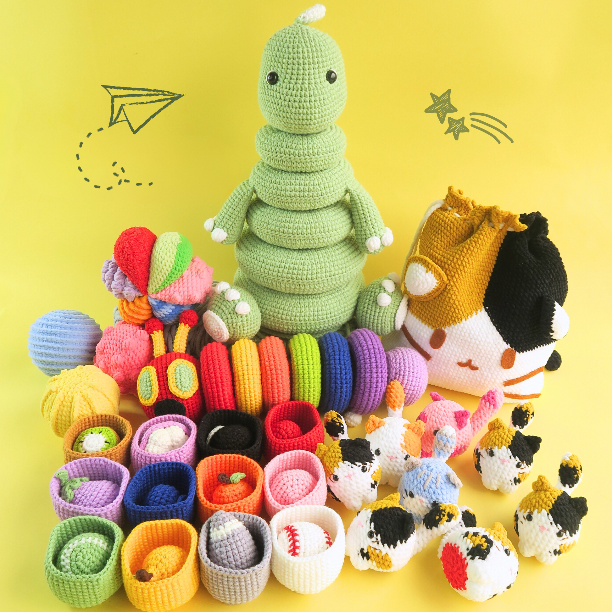 🦕 Dinosaur & Hungry Caterpillar Stacking Toys Crochet Pattern – Colorful stacking fun that develops hand-eye coordination and problem-solving.
