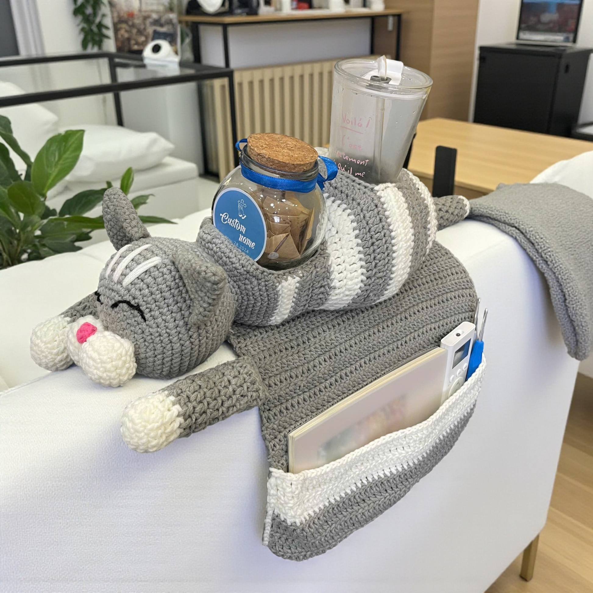 Keep your space tidy and adorable with this Cat Sofa Organizer Crochet Pattern! Designed as a cute kitty draped over your couch arm, it comes with handy pockets to hold remotes, phones, hooks, or little essentials—all while adding a touch of playful charm. 🐱💖